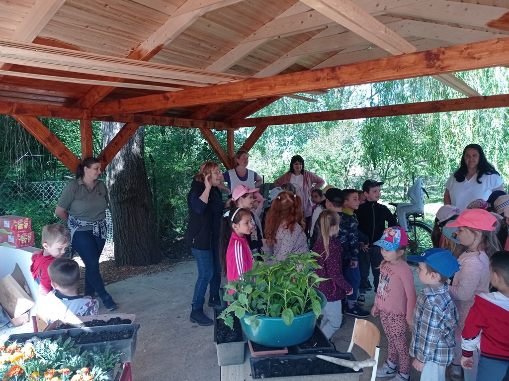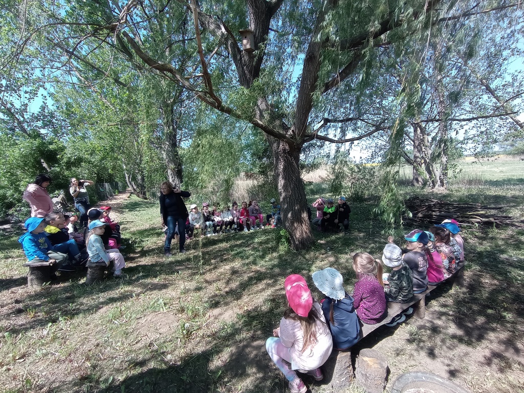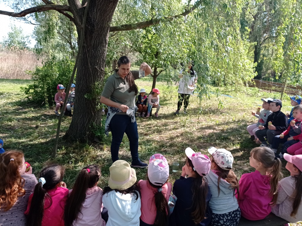 A területen megtett séta alkalmával madárfészket, madárodukat, rovarhotelt, vízparti növényeket láthattak. A program része volt az állatsimogatás is (ló, nyuszi, papagáj, baromfi,)
